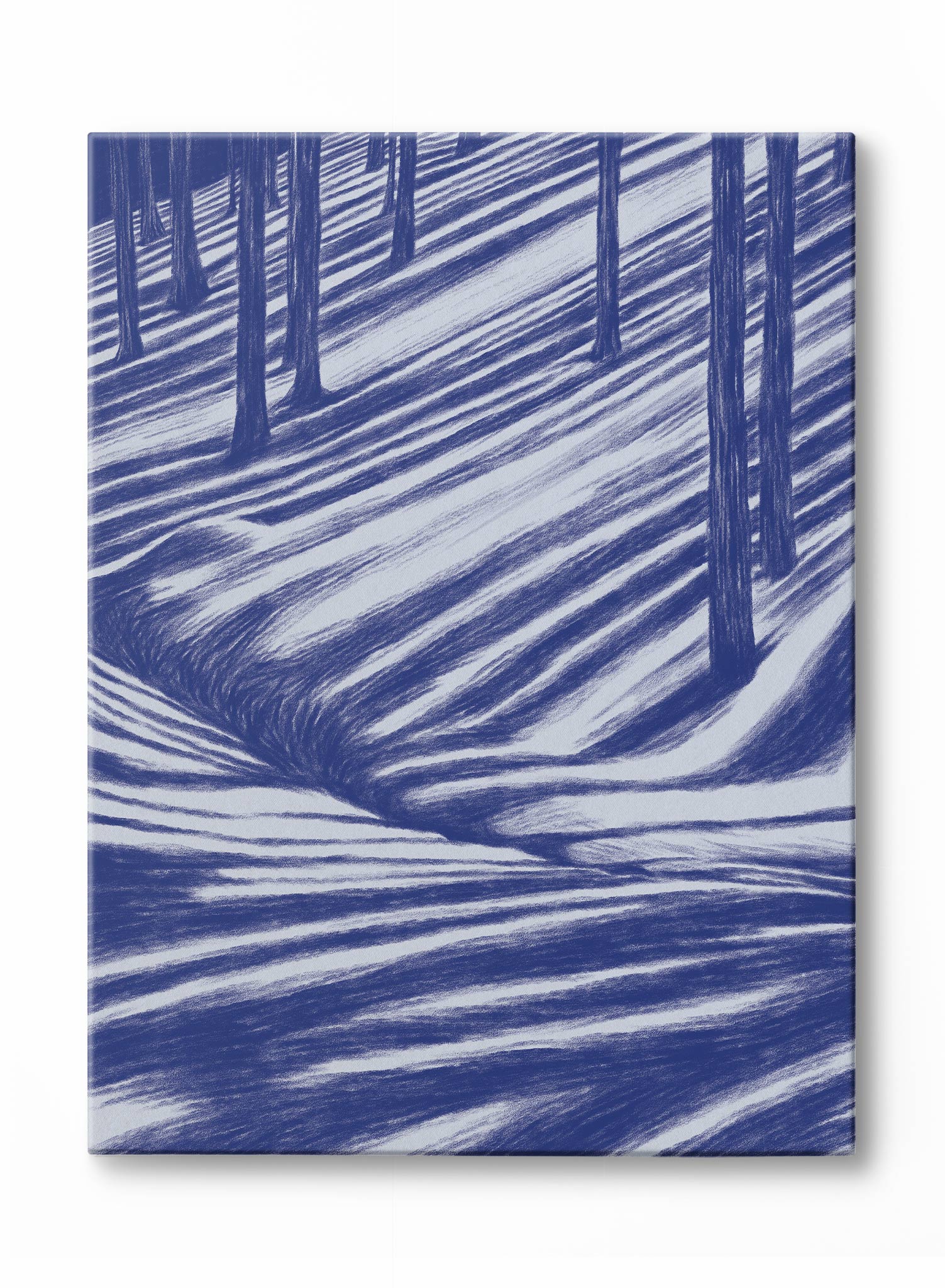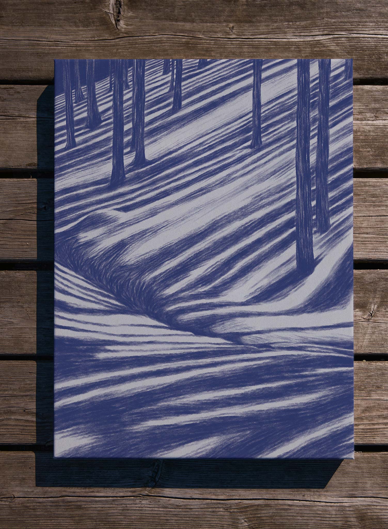 Tag along for this life-altering Moonbeam Hike! This dreamy illustration is composed of dark navy trees casting shadows on the snowy forest floor.
